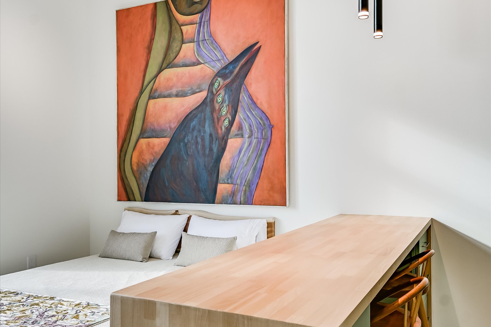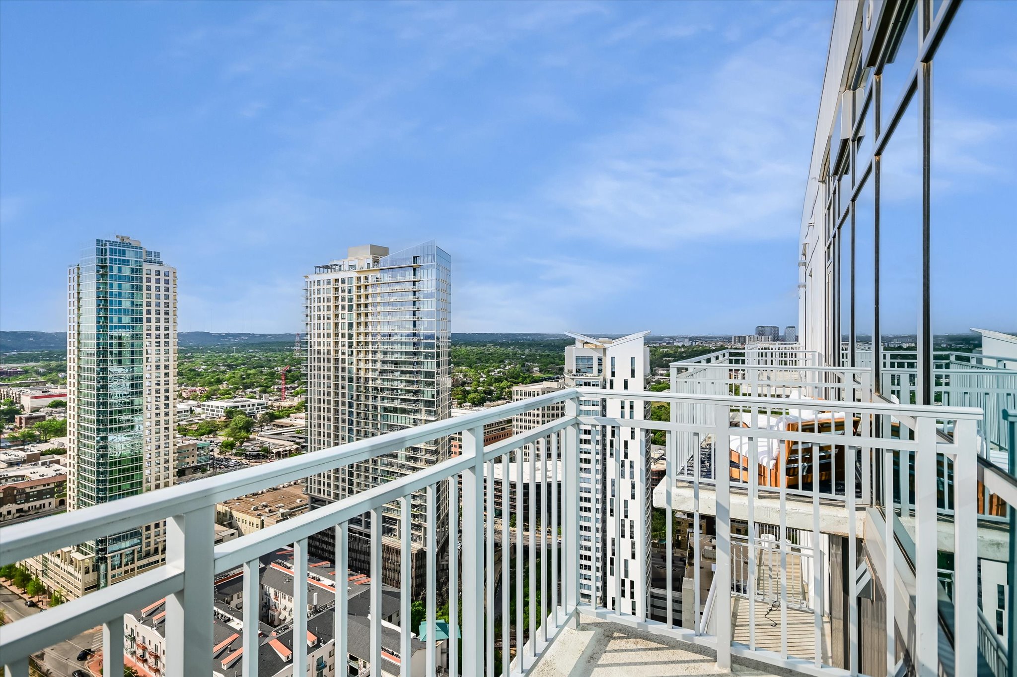 This penthouse studio unit offers a perfect launch pad for your Austin lifestyle. Featuring a balcony large enough to be an additional living space, you’ll want to step out first thing in the morning, and close out the evening with one last glance at the view. One of the few units with 11-foot ceilings, this home also features floor-to-ceiling windows which make the living area feel open and spacious. An island divides the space into living and kitchen zones and offers storage plus a place to prep with a view. Abundant, freshly painted cabinetry, full-size KitchenAid appliances and quartz countertops create a complete kitchen experience unusual for a studio unit. Lighting and floors have also been upgraded to effect a sophisticated ambiance and make this home move-in ready.